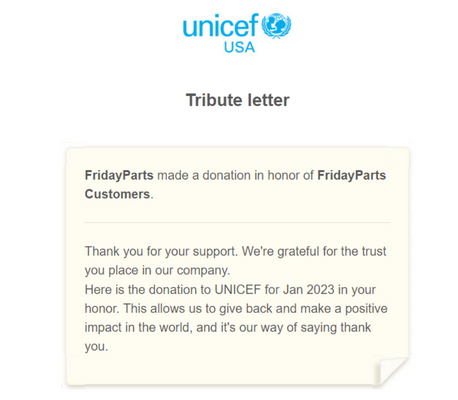 Donations of USD$454 in Januaray, 2023 | FridayParts Global Care Program